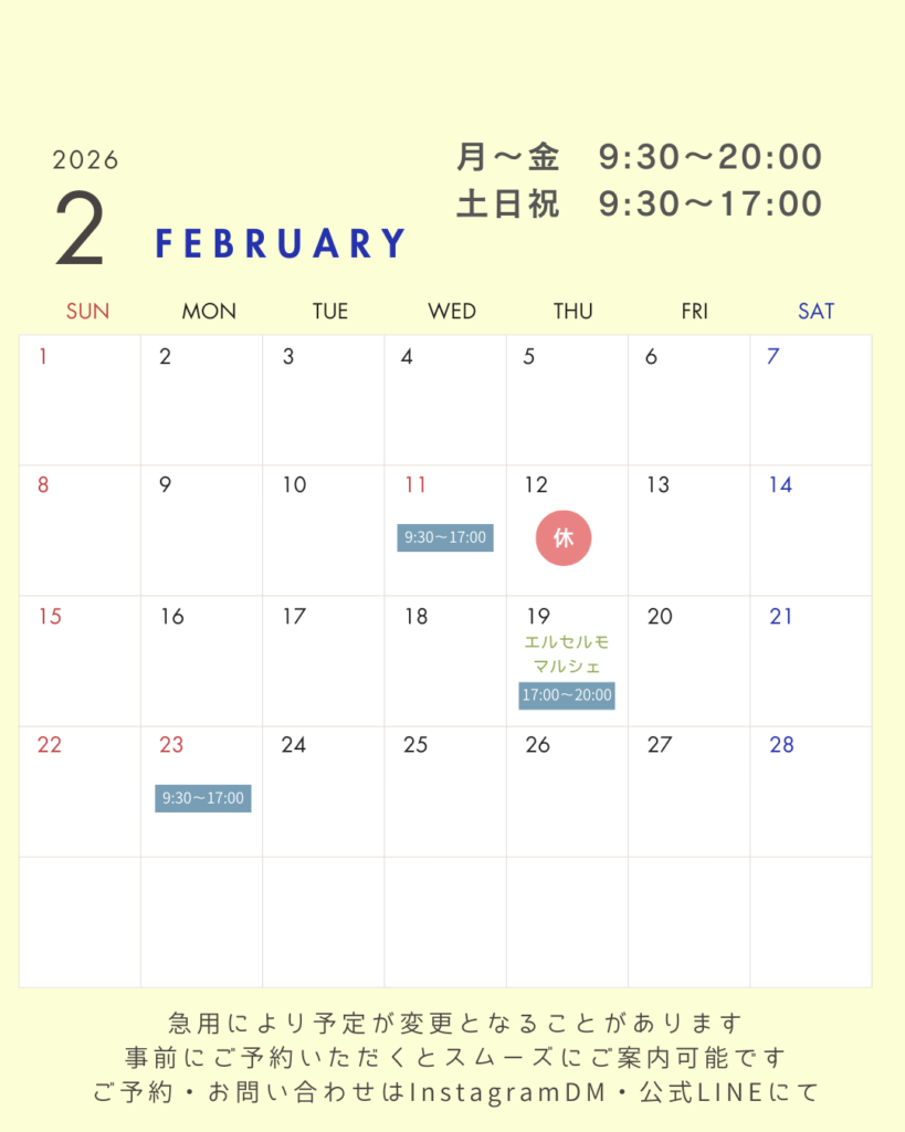 都合により急遽お休みを頂くことがございますのでできるだけ事前のご予約をお願い致します🙇