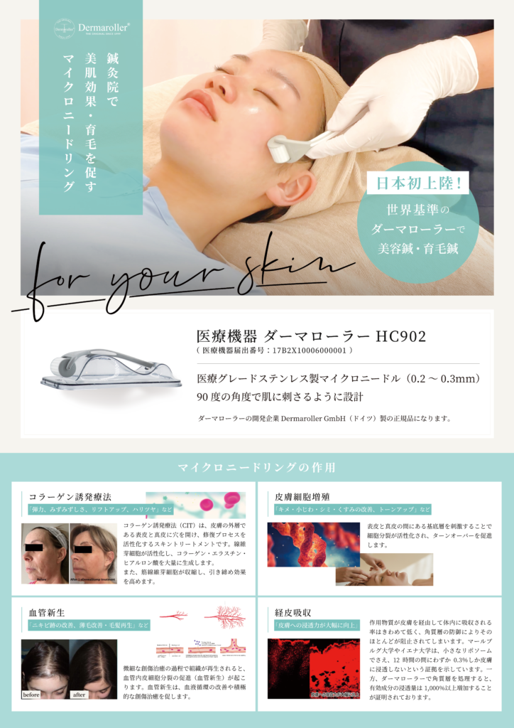 マイクロニードリングとは、微細な針で皮膚に無数の孔を開け、皮膚へのダメージを最小限に抑える一方で、皮膚内では損傷を認め、傷跡を残さずに創傷治癒により皮膚の再生を促したり、有効成分の経皮送達(ドラッグデリバリー)システムとしても広く使用されている。